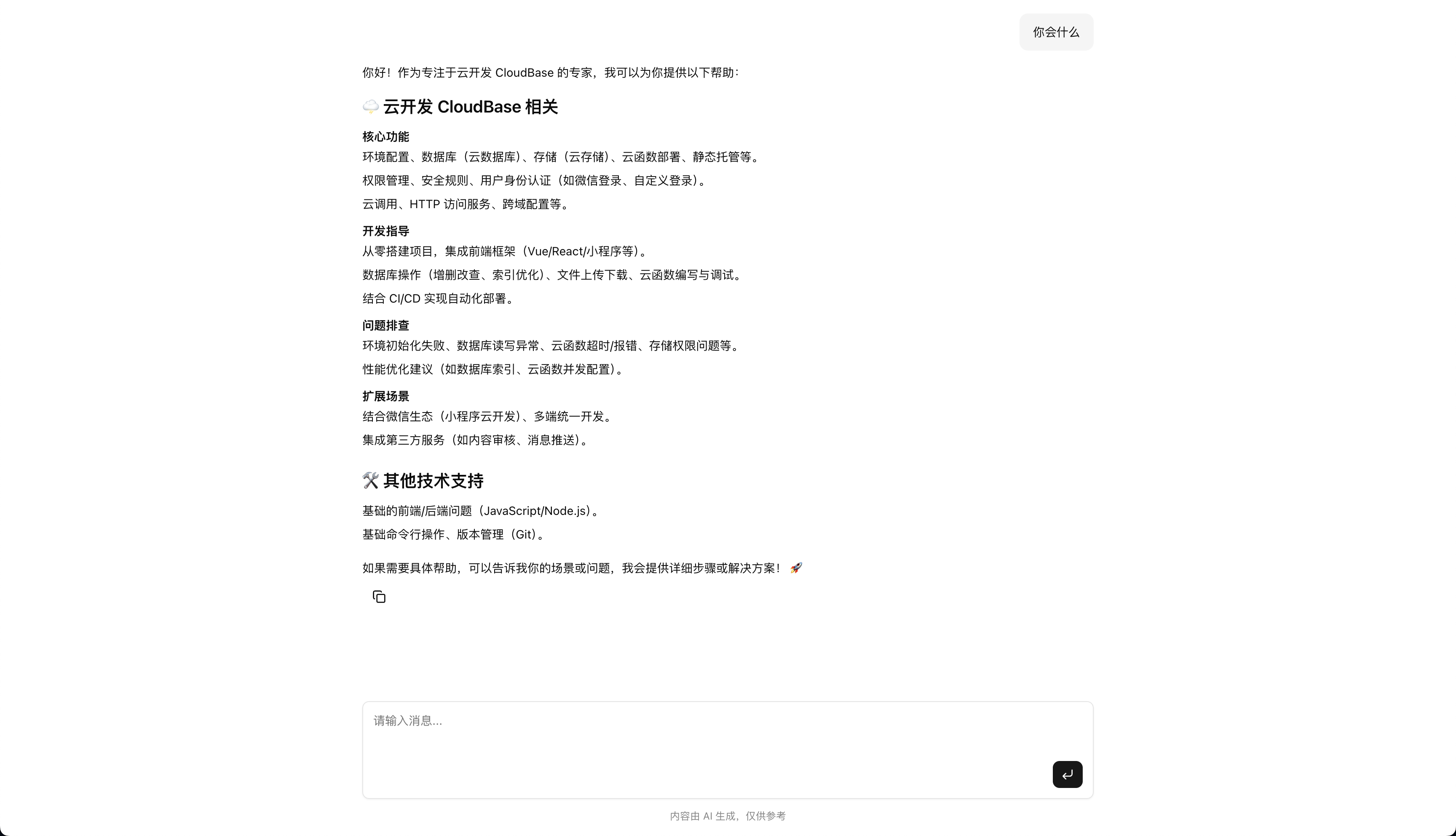 + `@cloudbase/agent-react-ui` 提供可直接接入 React 项目的聊天界面组件,可用于快速对接**符合 AG-UI 协议的 AI Agent**。当前组件仅作参考,推荐使用 [@cloudbase/agent-react-core](https://www.npmjs.com/package/@cloudbase/agent-react-core) 自定义 UI。