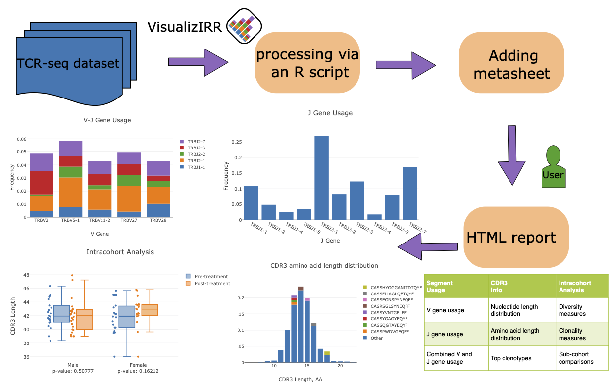An in-browser immune repertoire report, relying on VisualizIRR (Visualized Immune Repertoire Report), is used make immune repertoire analysis results simple to navigate and understand for the end user on their local machine or on a server.