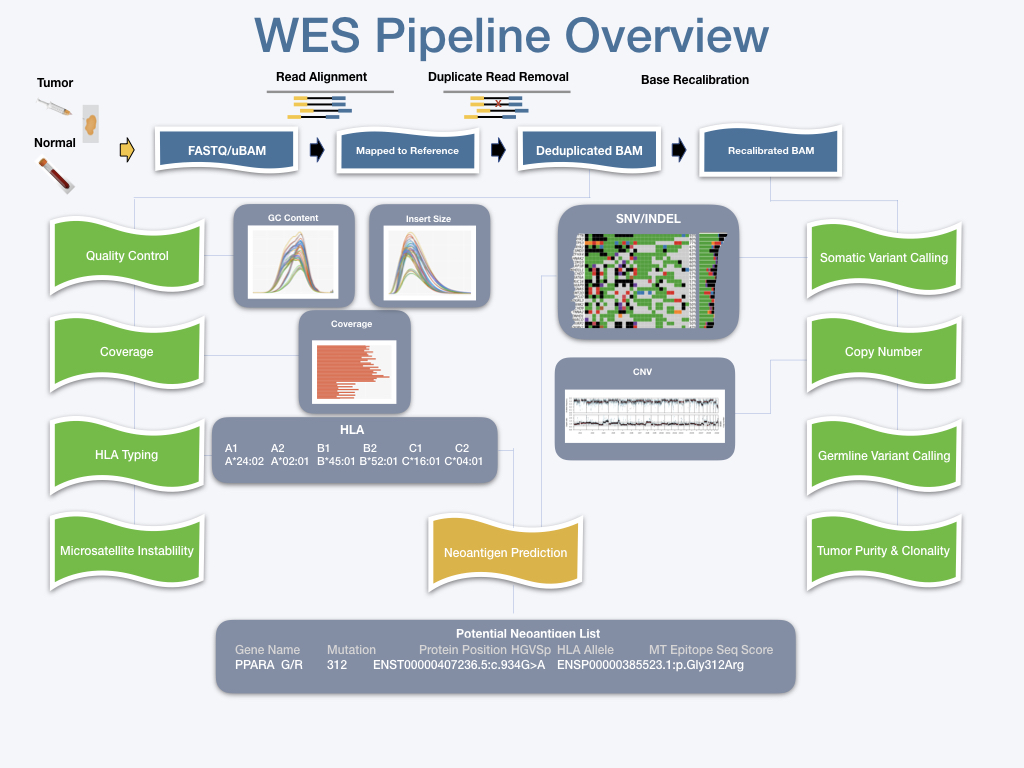 The CIDC whole-exome sequencing (WES) pipeline aims to identify and characterize key immunotherapeutic features of tumor samples. WES implements the [Gene Analysis Toolkit](https://gatk.broadinstitute.org/hc/en-us) (GATK) best practices and identifies both somatic and germline variants using Sentieon's TNScope and Haplotyper algorithms, respectively. Somatic variants are annotated using the Variant Effect Predictor software. As recommended in [Chen YC, Seifuddin F, et al. 2021](https://www.biorxiv.org/content/10.1101/2021.02.18.431906v1.full), the pipeline uses an ensemble of three callers (CNVkit, Sequenza, and Facets) to characterize tumor copy number variation: the overlap of the CNV segments is used to generate a high-confident consensus set. WES estimates tumor purity using two different software packages, Sequenza and FACETS, and also infers tumor clonal populations using PyClone-VI. The pipeline characterizes tumor HLA type (both class I and class II alleles) using HLA-HD, xHLA, and Optitype. WES also performs neoantigen prediction with pVACtools version 2.0.7 which incorporates netMHCpan 4.1 and netMHCpanII 4.0 as neoantigen callers and IEDB 3.1.1 to predict MHC peptide-MHC binding affinities and prioritize candidate epitopes. WES estimates tumor tcell fraction using TCellExTRECT and tumor microsatellite instability using MSIsensor2.